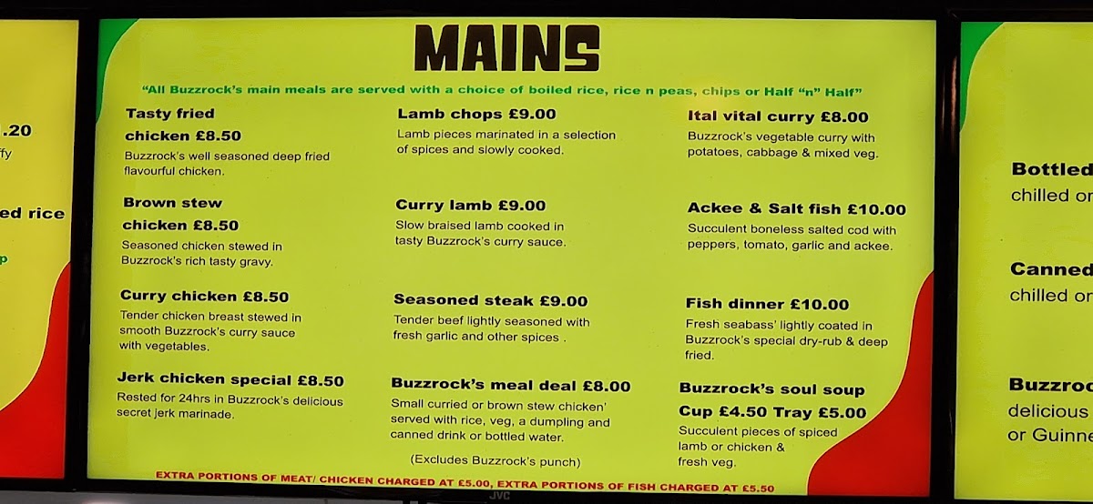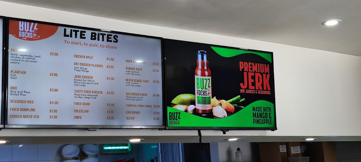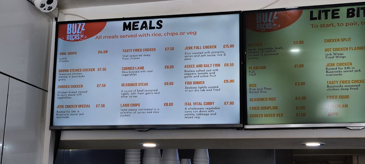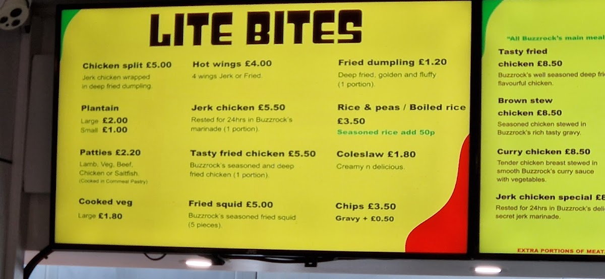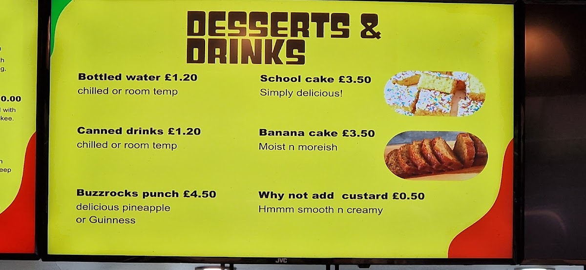 The menu at Buzzrocks Caribbean Takeaway offers a wide variety of flavors that showcase authentic Caribbean cuisine. For those seeking a lighter option, the Chicken Split, Plantain, Patties, Cooked Veg, and Hot Wings are perfect choices to start a meal. Moving to the main dishes, the Soul Soups and a selection of hearty entrees like Curried Chicken and Brown Stewed Chicken stand out. The Jerk Chicken Special and Tasty Fried Chicken cater to those looking for bold, flavorful chicken dishes. For a more indulgent experience, diners can enjoy the tender Lamb Chops, Brown Stew Chicken, and Curry Lamb. To complement the meal, a refreshing range of drinks is available, including Bottled Water, Canned Drinks, and the signature Buzzrocks Punch. For dessert, School Cake and Banana Cake offer the perfect sweet finish. With such a diverse menu, Buzzrocks combines traditional Caribbean favorites with delicious twists, all at affordable prices.